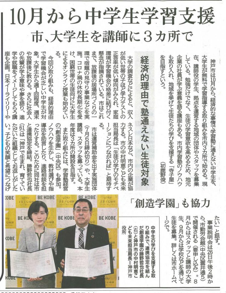 神戸市と創造学園は、経済的事情等で学校内外での学習機会を十分に得られていない中学生を対象とした「学びへつなぐ地域型学習支援事業」の実施における連携に関する協定を締結し、記者発表を開催しました。創造学園は、学習塾のノウハウを活かし、教材選びや講師役大学生へ指導法を助言、また進路相談を担います。「神戸で生まれ、育てていただいた組織としてお返しがしたい。子どもの笑顔